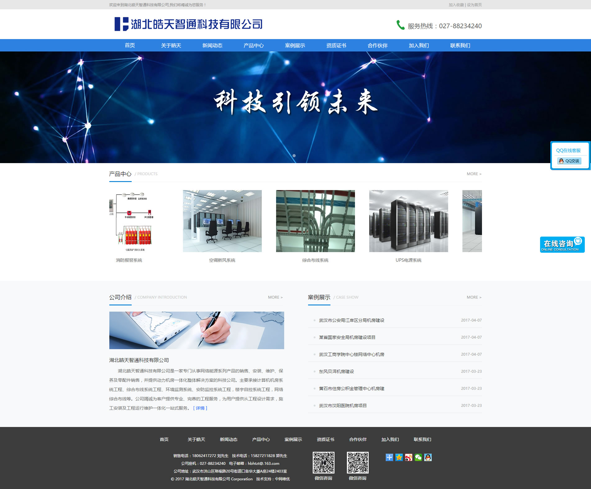 项目简介:湖北皓天智通科技有限公司是一家专门从事网络能源系列产品的销售、安装、维护、保养及零配件销售,并提供动力机房一体化整体解决方案。主要承接计算机机房系统工程、综合布线系统工程、环境监测系统、安防监控系统工程,楼宇自控系统工程,网络综合布线等。公司竭诚为客户提供专业、完善的工程服务,为用户提供从工程设计需求,施工安装及工程运行维护一体化一站式服务。在信息化高科技的督促下,湖北皓天智通科技有限公司将提供领先的产品,携手合作伙伴,共同为客户带来有效益的信息管理方式以及系统集成解决方案。